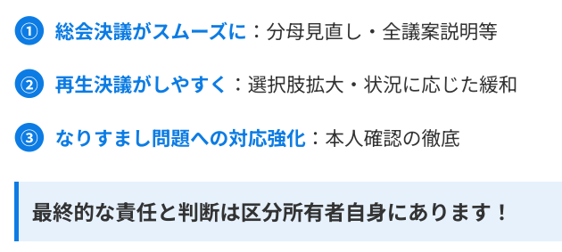 今回の改正は、こうした課題を解決して、マンションの運営をスムーズにするためのものなんです。
