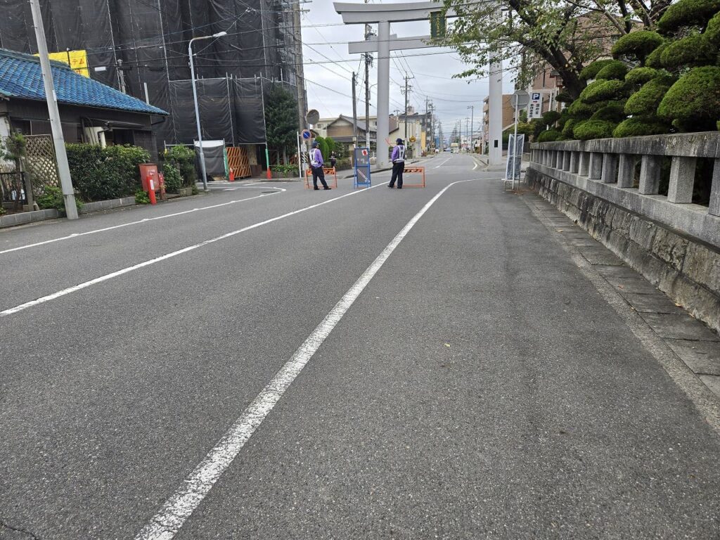 9時から国府宮神社の前の道路は、歩行者天国の規制で警備の方が進入禁止の看板を立て始めているところでした。