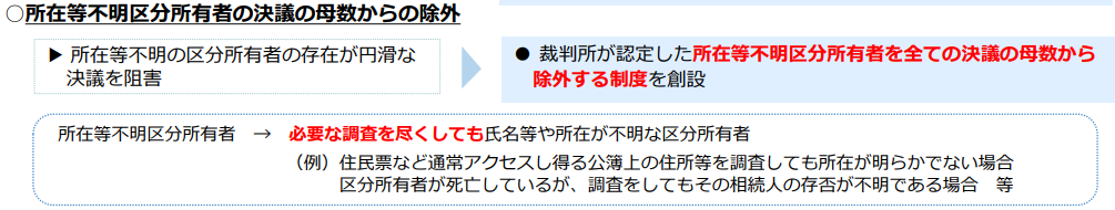 改正区分所有法では、裁判所の認定を受けることで、所在不明の区分所有者を決議の分母から除外できる制度が新設されました。