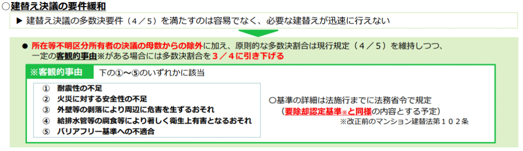 - 法務省:老朽化マンション等の管理及び再生の円滑化等を図るための建物の区分所有等に関する法律等の一部を改正する法律