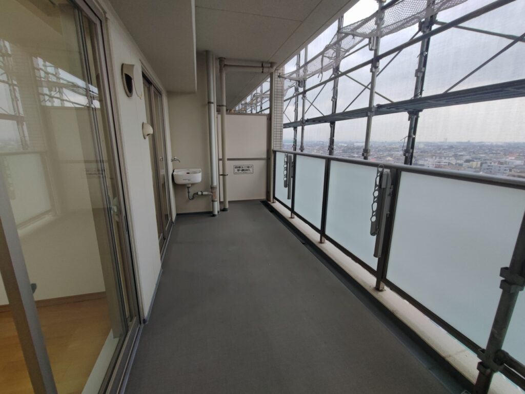 12階南向きはやはり抜けていて、稲沢の景色が広がっていました。大規模修繕工事中でも眺望の良さは十分伝わりました。工事完了後はさらに気持ちいいバルコニーになるはずです。