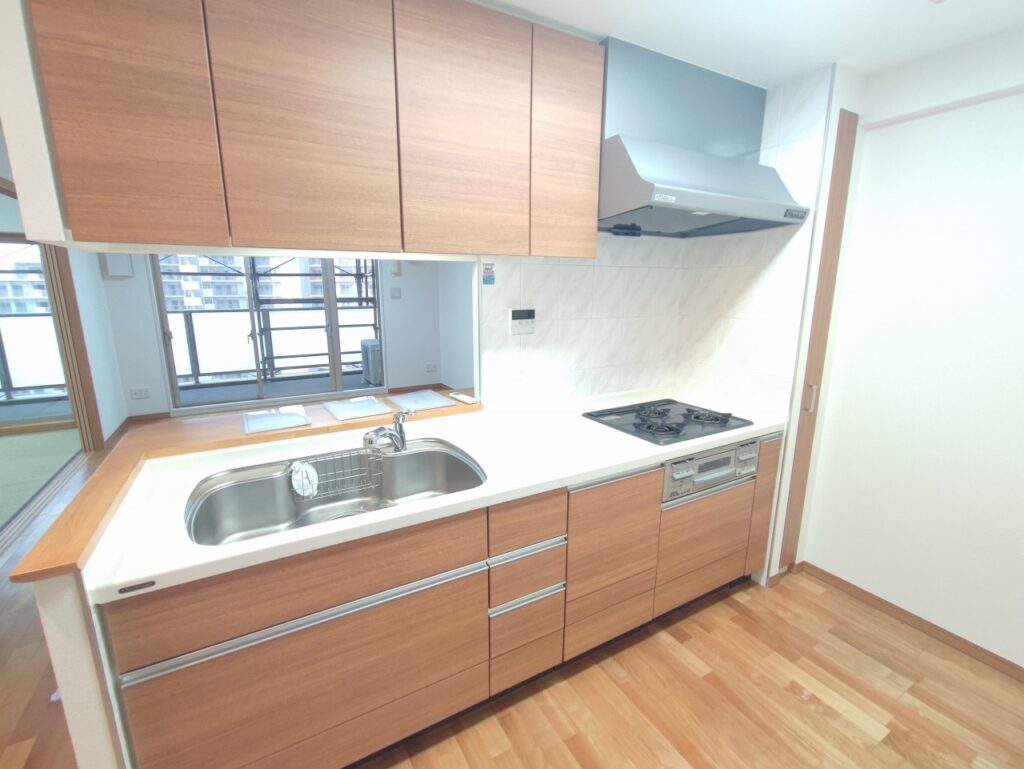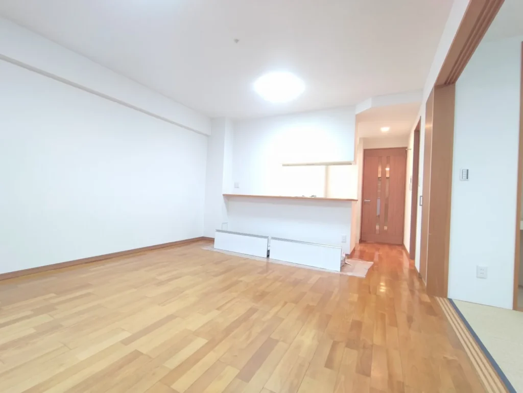 室内はフルリフォーム済みで清潔感があり、即入居できる状態です。約15.4帖のLDKは実際に立つとかなり広く感じます。